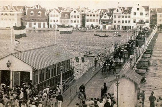 “De pontonbrug die Punda met Otrobanda verbindt, werd in 1888 opgeleverd. Daar gingen jaren van discussies aan vooraf. De verbinding tussen de twee stadswijken werd tot die tijd verzorgd door “yola’s”, kleine pontjes zoals de gondels uit Venetië, waarin je overgezet kon worden. In 1868, zo werd gemeten, lieten op een doordeweekse dag ongeveer 4.000 mensen zich op deze wijze vervoeren, over de Annabaai. Gouverneur De Rouville kwam dat jaar met het idee voor een vaste oeververbinding, maar dat stuitte op grote bezwaren. Een vaste verbinding, zo werd geredeneerd, mocht in geen geval de scheepvaart hinderen. Leonard Burlington Smith, de Amerikaanse consul op Curaçao had dit lang overdacht en kwam in 1886 met een uitgewerkt plan voor een drijvende brug. Een pontonbrug die open kon draaien om scheepvaart ongehinderd doorgang te geven en de overtocht tussen Punda en Otrobanda voor voetgangers mogelijk kon maken. Hij richtte zich tot het gouvernement om toestemming te krijgen om deze brug te bouwen en exploiteren. In 1887 leverde hij de tekeningen in, waarvoor hij de uiteindelijke toestemming kreeg. Op 30 april 1888 schreef L.B. Smith aan gouverneur Van den Brandhof dat de werkzaamheden klaar waren om geïnspecteerd te worden en de opening op 8 mei 1888 kon plaatsvinden. Smith vroeg de gouverneur tevens een naam te geven aan de brug. Het werd de “Koningin Emmabrug”. Op 8 mei 1888 konden er voor het eerst mensen tussen Punda en Otrobanda lopen. De brug kreeg de bijnaam “Swinging Old Lady” en is een van de meest bijzondere bezienswaardigheden van Curaçao. De brug van 1888 had houten pontons en lag in het verlengde van de Breedestraat in Punda, naar de Breedestraat van Otrobanda. Later werd de brug 18 m. meer noordwaarts verplaatst”.